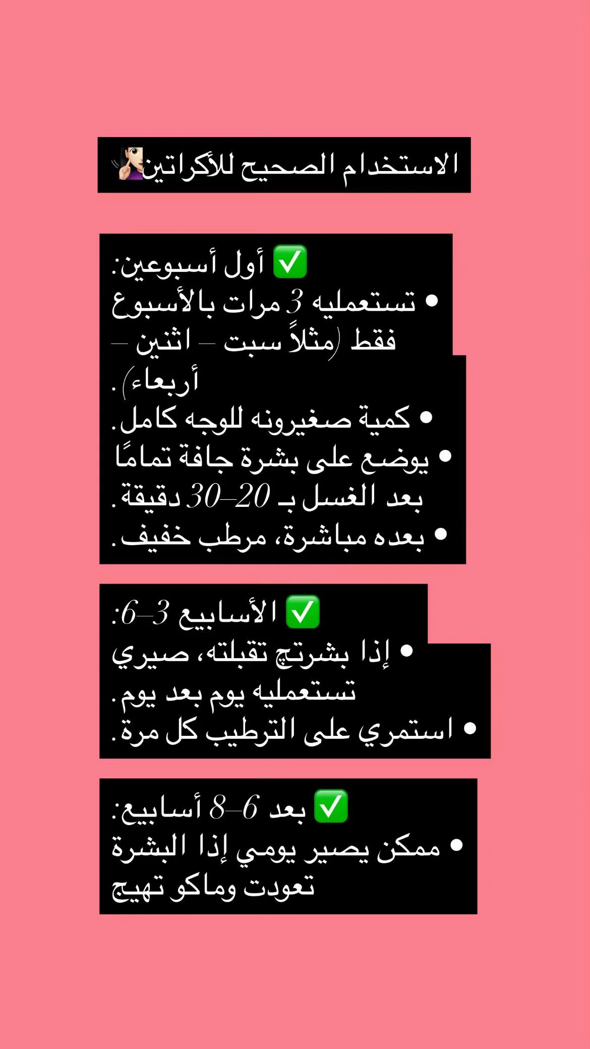 ⚠️ ملاحظة: قد يسبب جفاف أو تقشير خفيف في البداية، وهذا طبيعي. يُنصح بتجنب محيط العينين والشفاه.